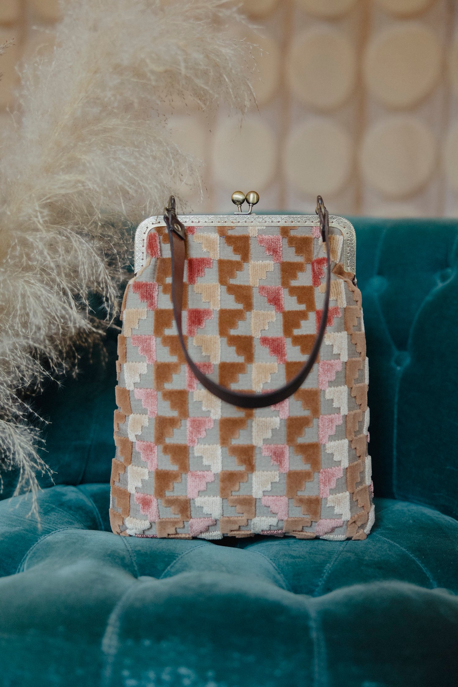 Da un lato Jacquard base color sabbia con motivo geometrico velluto color rosa antico, beige e caramello